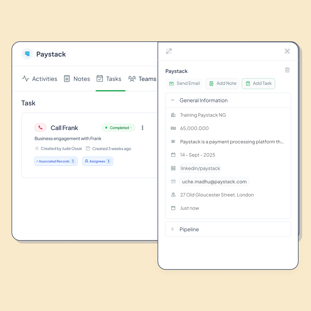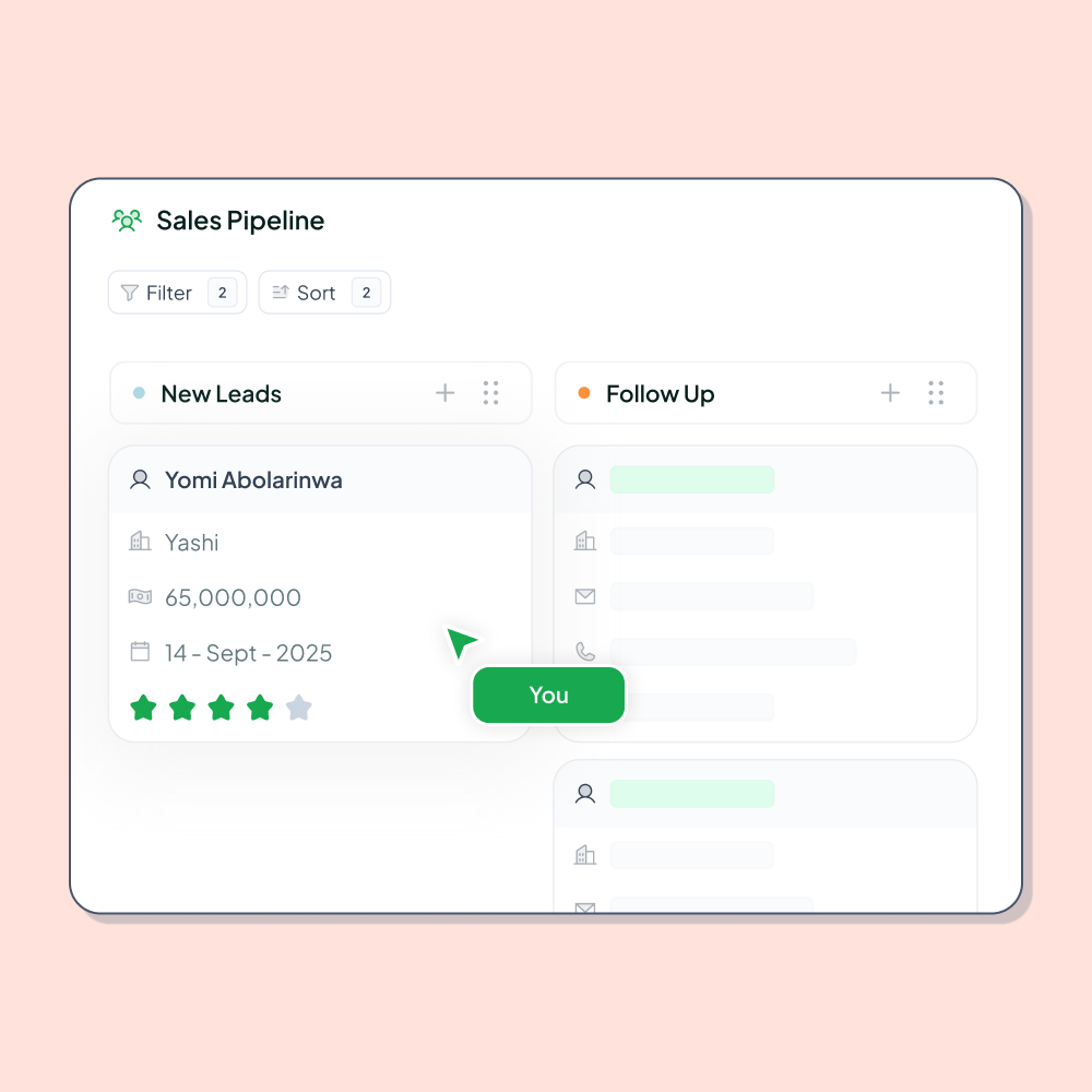 Easily filter or sort deals by date, owner, stage, or value. Find what matters in seconds.